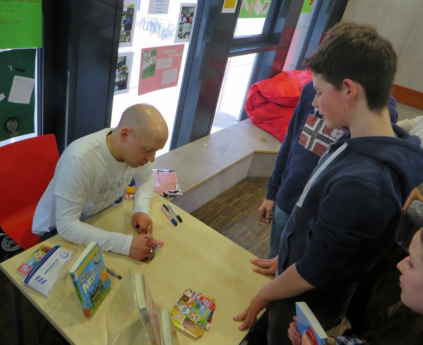 I'd also like to take the opportunity to say a few thank yous to the staff and students at the schools I visited on my tour. S1, Gill and Liz at Bridge of Don Academy, who kicked things off on Tuesday morning; Jan, Kerry and Linda, and S1 students at Torry; Mandy, Karen, Jenny, Sarah and S2 students—who produced some great work during our workshop—at Northfield Academy. Thanks to Mandy and S3 at Ellon Academy; Katie, Kerry and S1 at The Gordon Schools, and Jackie at Alford. Finally, thanks to Jill and her team at Mearns in Laurencekirk, plus a special thanks to Daniel who was at the workshop I ran during my first visit to Mearns in 2013. (see pic) I was really chuffed that he took the time to stop by in the library to say hello.