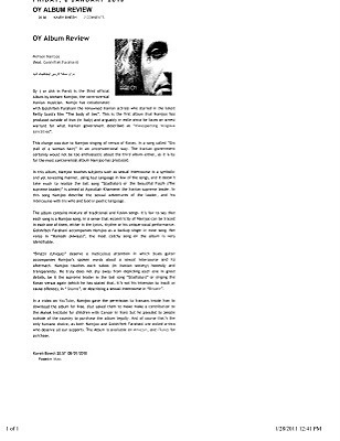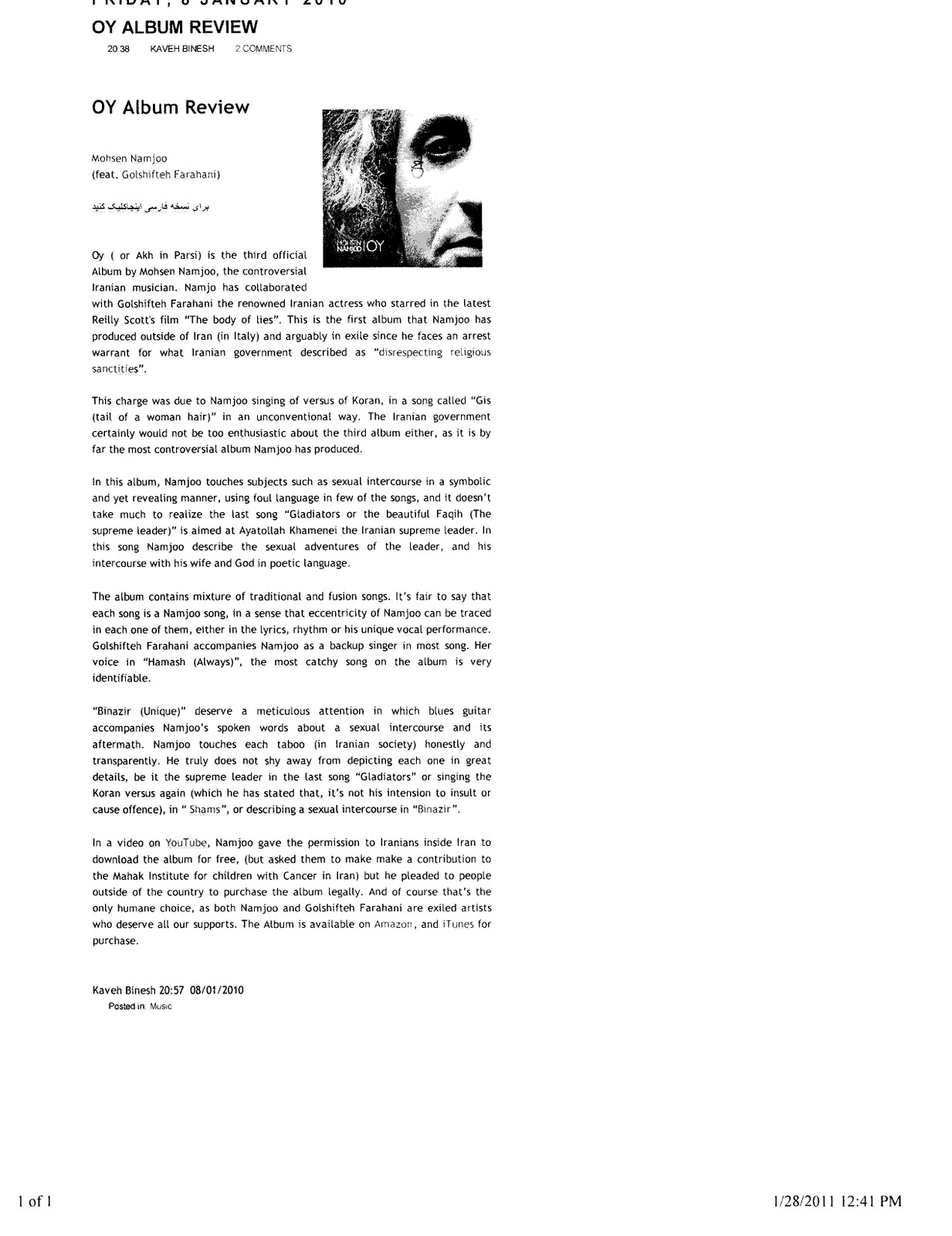 "Binazir (Unique) deserve a meticulous attention in which blues guitar accompanies Namjoo's spoken words about a sexual intercourse and its aftermath. Namjoo touches each taboo (in Iranian society) honestly and transparently. He truly does not shy away from depicting each one in great details, be it the supreme leader in the last song "Gladiators" or singing the Koran versus again (which he has stated that, it's not his intension to insult or cause offence), in Shams ", or describing a sexual intercourse in Binazir." A copy of the review is attached.