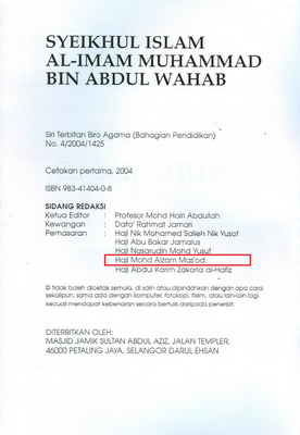 Sebuah blog memaparkan gambar buku (sumber klik sini) yang menurut penulis blog tersebut sebagai bukti Penyelidik JAKIM, bernama Mohd Aizam Mas'od ini memang seorang Wahabi. Saya tidak tuduh, oang lain tuduh. Klik di situ.