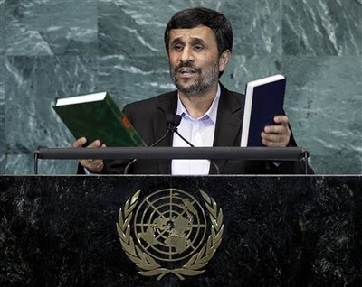 Bible dan al-Quran di tangan Dr. Ahmadinejad (kelmarin di Pertubuhan Bangsa-Bangsa Bersatu). Bible bukan untuk 'dibakar'. Membaca transkrip penuh ucapan Presiden Iran memberikan pelajaran akidah di pentas dunia tentang perlawanan 'setan' menentang 'keimanan' menaikkan bulu roma. Hebat sungguh singa baharu dunia Islam ini. Tidak terhegeh-hegeh dia mengejar Obama.