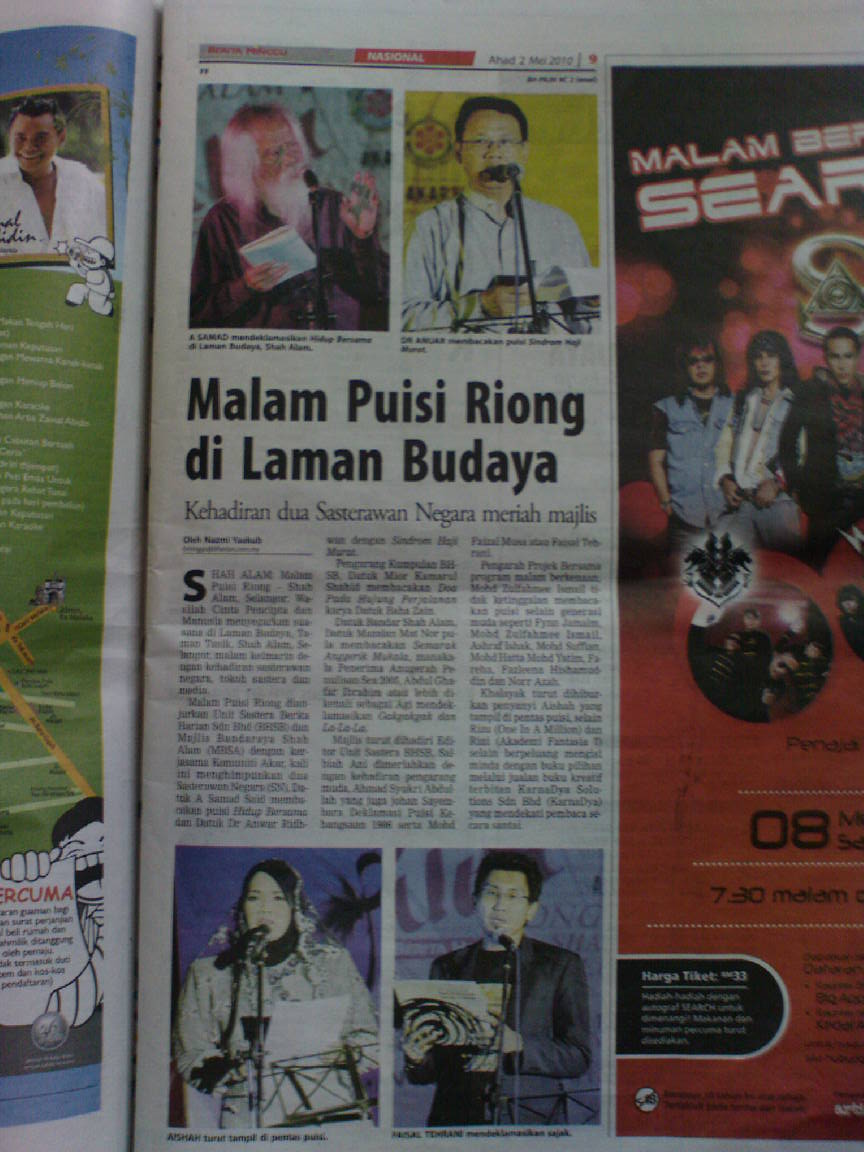 Malam Puisi Riong dianjurkan Unit Sastera Berita Harian Sdn Bhd (BHSB) dan Majlis Bandaraya Shah Alam (MBSA) dengan kerjasama Komuniti Akar, kali ini menghimpunkan dua Sasterawan Negara (SN), Datuk A Samad Said membacakan puisi Hidup Bersama dan Datuk Dr Anwar...