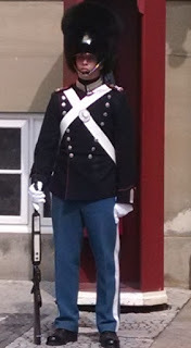 Okay, back to some of the sights. There are several palaces to visit within not-too-far walking distance (and of course we had to walk off some of those kugler, lol). We visited Amalienborg, which is the winter residence of the Royal Family of Denmark. It consists of four palaces in a square. We toured the museum in Christian VIII's palace and took pictures of the guards in their uniforms and tall bearskin caps.