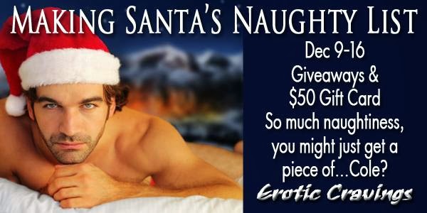 I'm a member of Erotic Cravings with seven other awesome erotic romance authors: Randi Alexander, Mia Downing, Darah Lace, Nese Lane, Em Petrova, Anita Philmar and KyAnn Waters. To celebrate our first Christmas together, we're sponsoring a promotion! Making Santa's Naughty List will run from Dec. 9 - 16 and every day will feature a different post from our author members and a chance to win a prize. There will also be a Grand Prize of a $50 gift certificate from Amazon or Barnes & Noble. Stop by each day to comment and have another chance to win! Hope to see you here then!