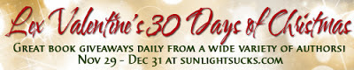 Another month-long holiday happening is going on at author Lex Valentine's blog. Lex is a multi-published erotic romance author who is generously giving away her own books as well as many other authors' at her blog Sunlight Sucks. Every day several erotic romances are up for grabs and all you need do for a chance to win that day's selection is leave a comment. There are books for every taste--straight, gay, menage, paranormal, shifter and more! Be sure to visit every day!