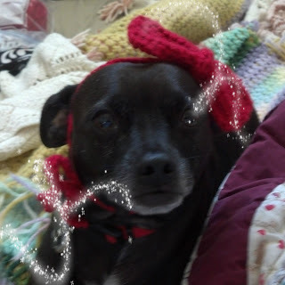 I am a devoted dog mom to a horde of little furry hair beasts. They pretty much rule my life. From a psychotic Great Dane to a little Chihuahua mix, my life is never boring. The star of the show has to be Taddy, the little Chihuahua. He is my little man and we are always together whenever I’m home. The term Velcro puppy completely applies. Some of the best moments of my day are at breakfast when he perches on my leg while I am trying to eat my cereal in hopes that I will share a nibble or two. The other is at bedtime when he attaches himself to my side while I read and then curl up to sleep. He has the sweetest personality ever and is a talker with his chuffing and adorable little howling when my husband teases him. The picture below is from last Christmas when I was making a headband for my niece and Taddy helped me model it, much to his horror.