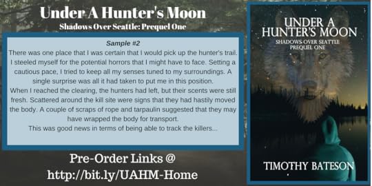 About The AuthorTimothy Bateson is a writer who broke into the market in 2014, with three short stories being featured in Halloween and science-fiction anthologies. In 2016, Bateson self-published a re-release of “Under A Hunter’s Moon”, the first of a several stories set in the “Shadows Over Seattle” world, which he co-writes with his wife, Sandi.Bateson is also a blogger who often spotlights books and fellow indie authors, alongside his other interests, such as the Brain to Books Cyber Convention events, falconry, journaling, quotes, and reading.So go get this fun summer read and get hooked on the world of Shadows over Seattle today! Until next time, Keep Reading!