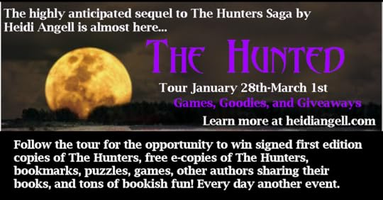 If you haven't supported the Thunderclap and entered to win a free limited edition signed copy of The Hunters paperback, be sure to do thathere.Here is what we have so far:1/13 Announcing the Tour atwww.heidiangell.com(That's us, right now!)1/13 The Hunters appears in theJanuary New Releaseson PD. Workman's blog.1/14 Character Spotlight of Chris forLinda Bloodworth’s blog.1/15 Why My vampires don't Sparkle onNotes Around the Bend1/15 Reading byFiatcelebrityon Twitch1/16 Character Spotlight of Carissa forL.Ryals1/19 Character Spotlight of Terah onNotes Around the Bend1/20 A Brief History of Vampires onAltered Instinct1/21 Author interview and review of The Hunters fromAndy Peloquin1/22 Character Spotlight for Lucas onKanundra’s blog1/23 Interview withTimothy Bateson1/24 (Character Spotlight) Fireside chat with Havoc andRichard Dale1/25 Youtube Live talk withJoshua RobertsonAnd here's what we have for The Hunted, so far!