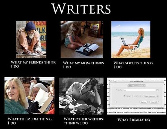 I love this one, in particular, because my friends aren't wrong. My mom is pretty close (Laptop instead of typewriter) I WISH it was the way society thinks (Do you know how hard it is to read a laptop screen in direct sunlight? I keep trying, but man!) I have dreams that the media will look at me the way they look at JK Rowling, and in my fantasies writing is a lot of "pondering" like the second to last image shows.But I have never seen a single one that has the "What I really do" right. Probably because it is impossible to catch that in one image, I suppose. Here is the closest I have been able to find: