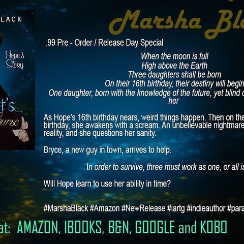 Genre: YA Urban FantasySynopsis: When the moon is fullHigh above the EarthThree daughters shall be bornOn their 16th birthday, their destiny will beginOne daughter, born with the knowledge of the future, yet blind of those closest to herAs Hope’s 16th birthday nears, weird things happen. Then on the night of her 16th birthday, she awakens with a scream. An unbelievable nightmare becomes her reality, and she questions her sanity.Bryce, a new guy in town, arrives to help.In order to survive, three must work as one, or all is lost.Will Hope learn to use her ability in time?My Take: I received an advanced reader copy for the purpose of review. And man, am I glad I did. This story is the first in a three-part series about three sisters who are cursed. Hope is definitely a character I can relate to. Grade oriented, not really part of the popular crowd, and with no desire to be, she is just a normal teenager struggling with getting along with her sisters, looking forward to getting her license... and having the joy of always being thrust into the spotlight she hates, because she is one of the only sets of triplets ever born in their small Wisconsin town.