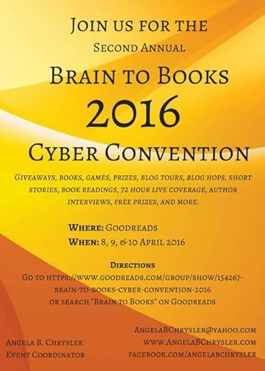 Hello lovelies! I found out this weekend about a very exciting event coming April 8th, 9th, and 10th. It is the second annual Cybercon hosted by Brain to Books on Goodreads. If you love books, then you definitely want to be a part of this event! The con will have a lot of really great events going on. There will be givaways, readings, character battles, panels, and opportunities to interact with authors. I am super excited! There is just so much going on, and I am eager to be a part of it