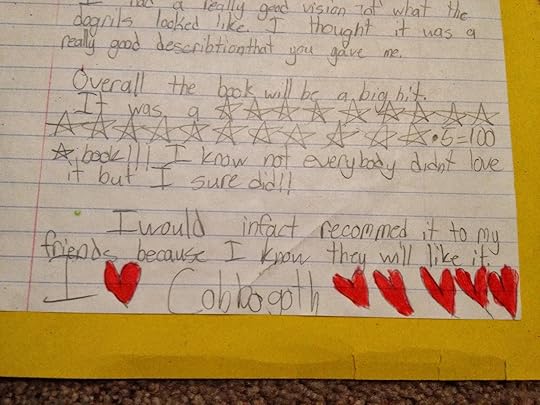 To say thank you, the kids made and gave me one of the best gifts an author can get. They each wrote a book review of what they thought of the book. And then, they drew a picture of their favorite scene from Cobbogoth.