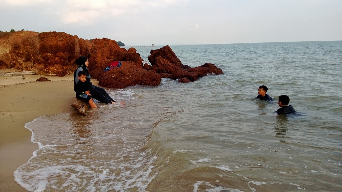 Tak berapa advencer bebudak ni. Takut-takut je.Zarif lagilah pulak. Langsung taknak masuk air. Dia dok kat pasir tu je, buat sand castle, kutip shell, main dahan kayu.