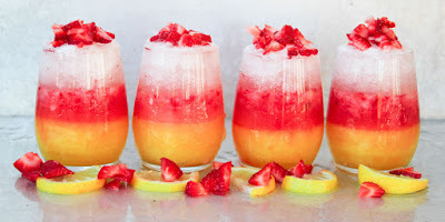 This drink was inspired by the memories of taking lemon drop shots back in the day at bars with friends. This version makes the boring shot into something beautiful you can make at home. Mango, strawberry/pink lemonade, and regular lemonade come together to create a fun, boozy lemonade that anyone can make. The secret is to chill each layer until its ready to be poured into the glass, which keeps the layers separate, but equal in the quest to booze things up.