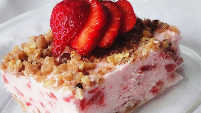 ~I chopped up my two cups of sliced strawberries to make them finer--the sliced strawberries got very hard when frozen and made the dessert hard to cut. The strawberry juices got into the fluffy mixture, turning it a pretty pale pink color. I had no problems cutting the frozen dessert then. I had a bit of a problem with the meringue portion, as my sugar didn't dissolve, no matter how much I whipped it. When I added the strawberries, though, the sugar dissolved just fine and the dessert came out fabulously.