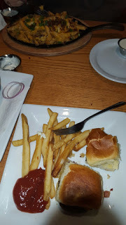 She and I went to Chili's later. I love their hamburgers--I think I have what's called the big mouth bites. She had this huge plate full of French fries covered in cheese and bacon bits. I can't think of the name of it, but man, it's good. (That's why there's a fork on my plate lol,)We returned home later and celebrated with the hubby once he got back from his dentist appointment.