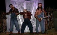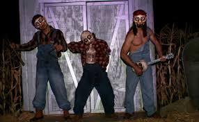The guy with the shotgun was talking to the people in the trailer when suddenly someone covered in blood burst out from the shack’s screaming horribly. As the rednecks chased the bloody person, the trailer pulled off from the shack. They did a couple more stops: one was a graveyard where body parts stuck up from the ground and a casket was partially open with something trying to climb out. Another stop was a pirate ship where a couple of the people jumped off the ship and made a run at the trailer.