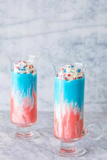 Layer bottom of glass with red ice cream, then plain vanilla and blue ice cream, using long spoon or knife drag it from the bottom to the top, stirring in between to mix the color (do not overmix).