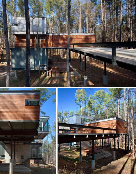 A concrete vertical element in the center allows for the drastic cantilevers on each of the three stories of this house, which in turn create open-but-sheltered outdoor spaces below them. From the inside, this creates open interior spaces that thrust out into the forest and create a connection with nature.
