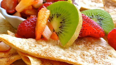 Bake in the preheated oven 8 to 10 minutes. Repeat with any remaining tortilla wedges. Allow to cool approximately 15 minutes. Serve with chilled fruit mixture.