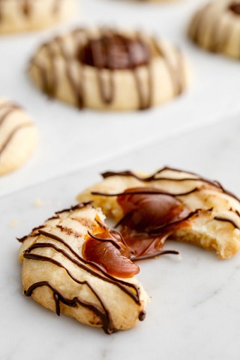 Fill each cooled cookie cup with 1 teaspoon caramel and lightly drizzle with melted chocolate.