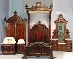 While the middle and lower classes, and servants in large houses, had to make do with hardwood floors, unadorned furniture and hand me down rugs, the master or mistress of a great house slept in beds of rare woods furnished with feather mattresses and fine linens. The newly rich would purchase matching bedroom furniture like this rosewood suite from the 1860s. The armoire, washstand and commode on the left side were necessities in the days before built in closets, clothes hangers and bathrooms!