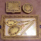 sets of brushes, combs, hand mirror, and bottles or jars, all resting on their own tray. The materials for these ranged from horn or carved wood to elaborate silver. Ivory, plain or carved, was also popular in the days when people considered wildlife a commodity.