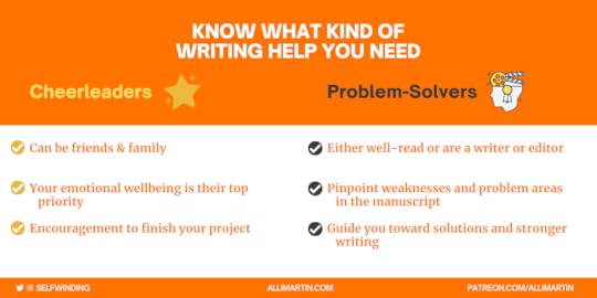 Cheerleaders usually come from your friends and family. They’re people who care about your emotional wellbeing more than your writing. They’re not going to lie to you, but they aren’t going to nitpick your grammar either. Cheerleaders are so important during a first draft to encourage you to keep translating your story from thoughts to prose, but they can also be important during revision while you’re crafting that first draft mess into an understandable narrative. Cheerleading support can take the form of an enthusiastic first reader or an accountability partner, or someone else who is generally excited every time you tell them you put words on the page. Cheerleaders help you finish whatever stage of the project you’re on, but they don’t help you make your writing better.