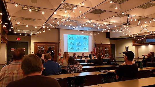 My first stop was the Orange County Library to learn about world building from Arielle Haughee. Her approach to world building starts with creating maps, ranging from the broad to the more specific aspects of the world. I tend to make maps late in my drafting process—you know, after I’ve written the location of the main character’s house and then written something else that completely contradicts that. With Arielle’s process, I could have those details knocked out in advance and have some potential ideas for conflicts and obstacles presented by the distribution of resources in the world and difficulty of the terrain and transportation. Basically, her presentation knocked my planning socks off, and has encouraged me to go play with the mapmaking app I found a few months ago.
