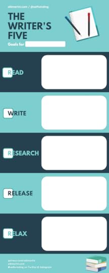 The Writer’s Five Worksheet is a blank sheet for you to write and track your goals for the month. Each goal is based around one verb: read, write, research, release, and relax. Basing the goals around a simple verb already tells you a lot about what your goals will be, thus making them easier to compose.