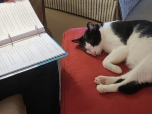 The manuscript is currently off with a friend from the MFA and my MFA thesis director, and I’m doing a final (“final”) hard-copy review wherein I’m discovering horrifying typos and further tweaking sentences (because I. Am. Unstoppable!) Our formerly feral cat Pink is assisting in this work, but he keeps falling asleep on the job (sometimes literally on top of the book).