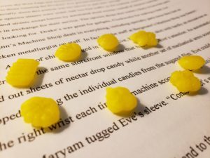 The picture here is the drop candy composed around a section of the novel in which the main character watches automated robotic arms roll out and drop nectar candy. (Lofty Pursuits was absolutely the inspiration for adding this world-building moment.)