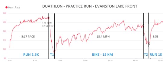 In two weeks I'll be in Tuscaloosa getting ready for the weekend of racing. Yesterday's workout was a practice duathlon at shorter distances. The objective was to get use to going through the segments of Run - Bike - Run. It's an opportunity to practice the transitions and reacquaint myself with how to use the Garmin watch when it is set in Duathlon mode.