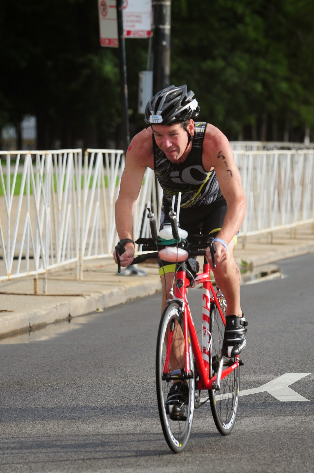 We swam south from Buckingham Fountain towards the Shedd Aquarium and then ran across Lake Shore Drive to the transition area. For the bike course we rode north on Columbus Drive to Wacker and then went west and south on Wacker, then turned around and rode back. We did that four times. Portions of Wacker were the underground segments which are always being used for films like Batman Returns and the Blues Brothers. It was a flat and very fast bike course. I averaged over 21 mph and I was passed by a bunch of riders who were riding MUCH faster.