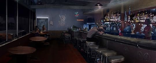 She was sitting over there, he says, nodding his head towards the empty table in the middle of the barroom. Doing shots with Hector and Luis and that gal from small parts.