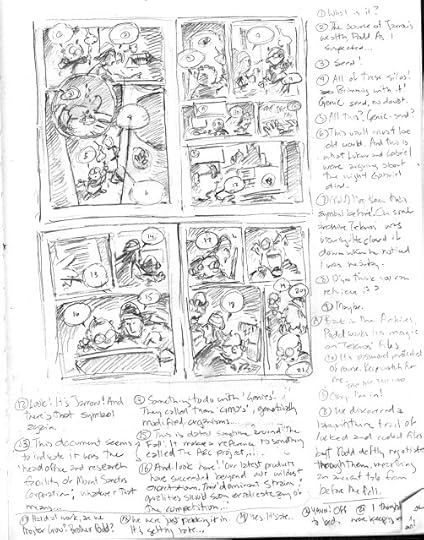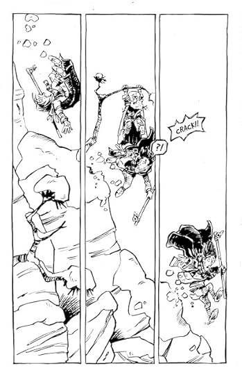 Again, you can see how the layout for this page tracks pretty closely to the inked final below. Interestingly enough, in this sequence I have Podd with Crow (upper right). This is p.26 in my thumbnail layout, but I did a major re-write after finishing the thumbs, inserting ten more pages before this one, so that the inked version below is numbered p. 36 in my file.