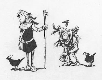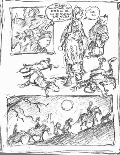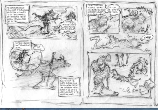 My first 2007 crack at Crow. You can see that I based the final version of the book on these images - if you click on the page above it will take you to a pdf of all of the first seven pages I completed.I had also talked last post about the thumbnailing, most of which was done a decade later when I returned to the story. My process has changed on subsequent books (I am now well into Book 3), but you can see here that I wrote the text in the margins as I thumbnailed it!