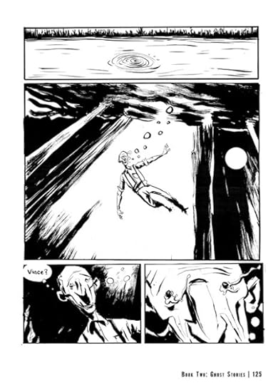 Two images from Ghost Stories. This is an imagined sequence as Lou disappears into his memories. Lemire's use of darks and lights here, the brushwork in the underwater light, the tears streaming from his eyes as he descends into the water. How can you not be moved by this art??There is so much more art I would love to share from this book, but my best recommendation is for you to go out and buy your own copy or borrow it from your local library and see for yourself why this book is a masterpiece. Re-read it if you haven't lately. Just please give the time due to each panel and let yourself soak it in on a deeper level. And experience the power that can reside in visual story-telling at its best.