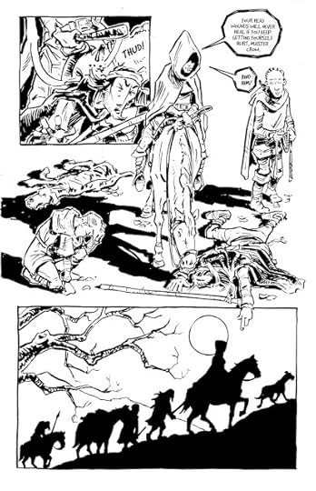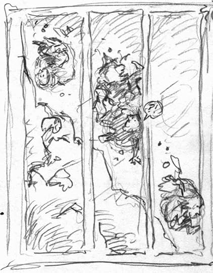 I always liked this sequence, which happens early in the story. Hopefully you can decipher my thumbnails (they really are just for me to understand!) but I think you can see how the page structure and Crow's body language translates to the final line art.