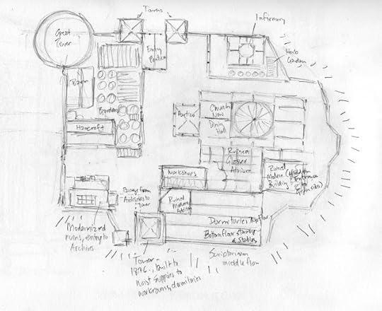 As you can see in my notes the portico of the original monastery is in the foreground left, a ruin with modern architecture (now itself in ruins) is sandwiched in the middle, and a later 16th century dormitory with a modern copula is on the right. On the front of that building has been tacked on a stone construction, post Fall, with a thatched roof, in essence reverting to a more primitive form of construction. The tall tower I imagined as being built later than the dormitory, maybe 1800's, as a means to transport goods by elevator from floor to floor of the dormitory (possibly having been converted to workrooms) but also heightened and used as a watchtower.Finally I realized I would need a ground plan to keep everything in order as the story progressed, so I sketched out that in my book as well.