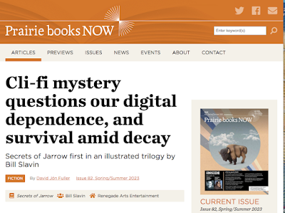 Cli-fi. Now there is a term I hadn't encountered before. It turns out Mordecai Crow is at the relative cutting edge of a new sub-genre of science fiction, cli-fi or climate fiction. I first encountered the term in a really nice article on Secrets of Jarrow in Prairie Books NOW by David Fuller, which I will link to below.