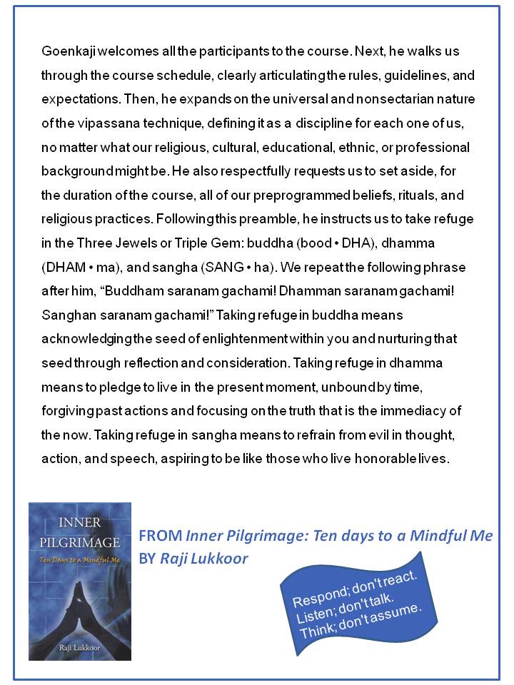 The three-day rigorous practice of watching my breath prepared me—mind and body—to enter the realm of vipassana. The technique itself is not complicated; it consists of observing the sensations the breath creates. Sensations represent pre-conditioned, mental patterns of the mind. They are a basic form of experience and existence that precede the thought processes, i.e., they exist before the litany of commenting, editing, labeling, qualifying, an...