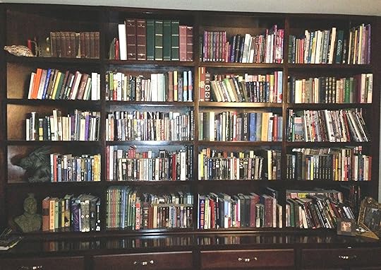 This is the bookshelf in my office. When we moved in, this was a blank wall. The room had no shelves of any kind. Hell, no closet either. So we had this built across one entire wall, with deep cabinets underneath to hold my board games and zombie heads. As is proper.