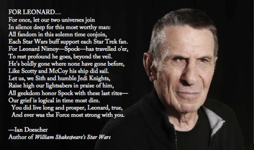 Ian Doescher, the author of William Shakespeare’s Star Wars, tweeted out a sonnet for Leonard Nimoy.