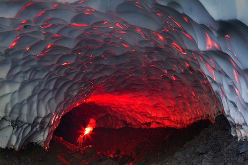 “The bizarre combination of freezing cold winter and active volcanos are married together in these stunning photos by Denis Budko. The two seemingly opposite elements are found existing harmoniously in the cave of the far east peninsula known Kamchatka in Russia. Until 1991, the caves were strictly off limits to foreigners. But ever since the fall of the Soviet Union, fantastic natural wonders like this have been shared with the rest of the world.”