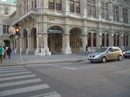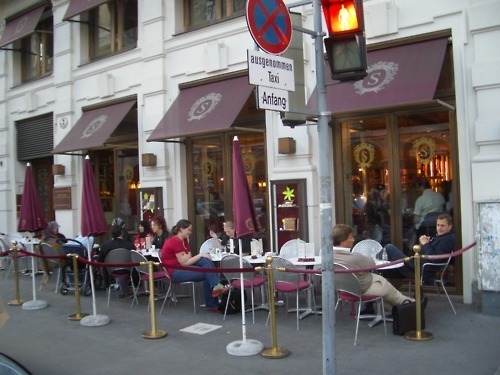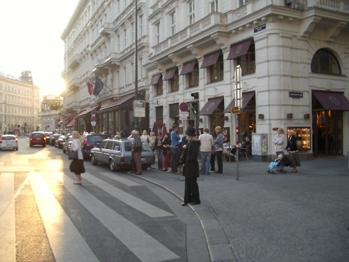 Vantage point of Character Kalen Immel, of the Cafe Sachar from the corner of Karntner Strasse and Philharmoniker Strasse in Vienna.