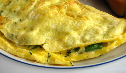 I sprayed a non-stick skillet with olive oil spray, added the egg mixture, lowered the temperature to 3, and allowed the eggs to solidify without browning at the bottom. Once they were semisolid I lowered the temperature further (I don’t like crisped omelette!), added the sautéed veggies onto one half and sprinkled the whole thing with shredded cheese – shredded sharp cheddar works really well for me, but mozzarella is good, too. I topped the cheese with chopped cilantro and folded the omelette in half. I cut it into two pieces-- and lunch was ready!