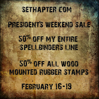 50% off my entire line of Spellbinders products (dies, stamps, embossing folders) and 50% off all wood mounted rubber stamps in my online shop. No code needed. You know the fine print...while supplies last, no rain checks, yada yada yada.