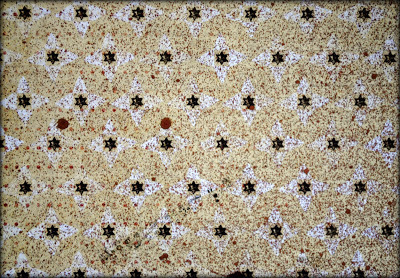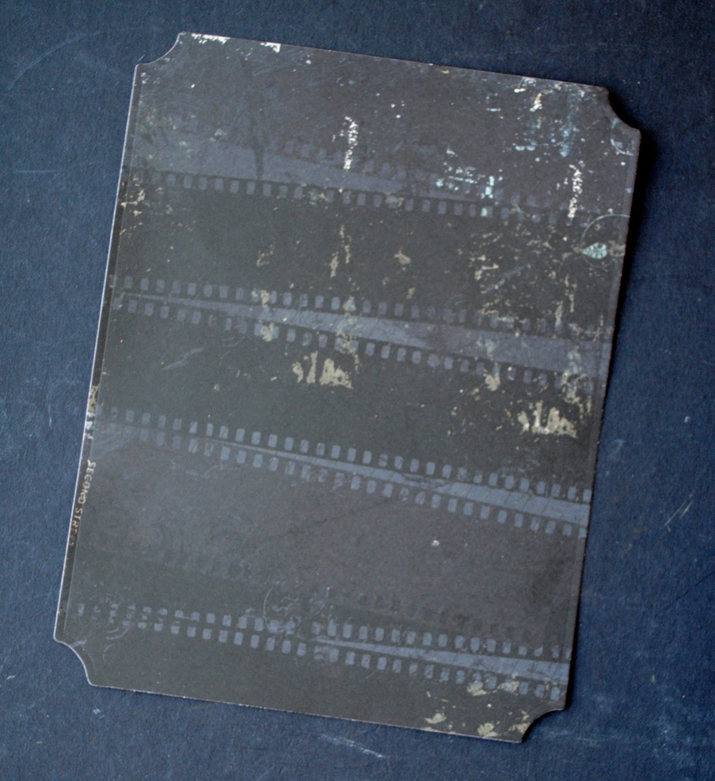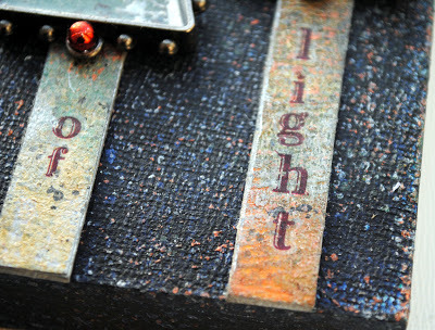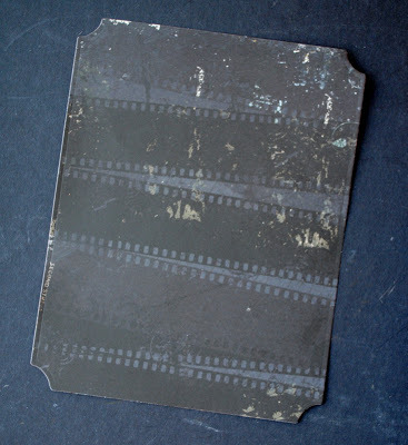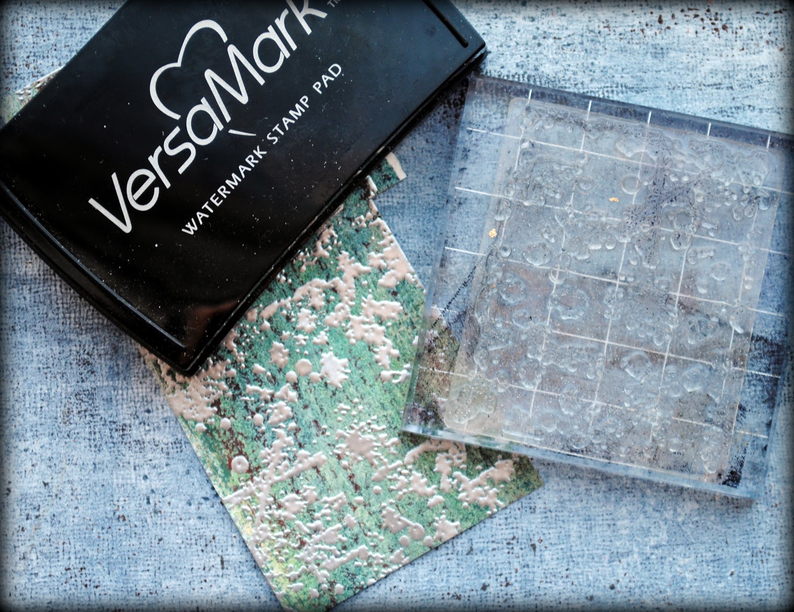 I selected one scrap that called to me embossed the surface using a clear stamp with a random and grungy design, a watermark embossing stamp pad, silver embossing powder and a heat gun.