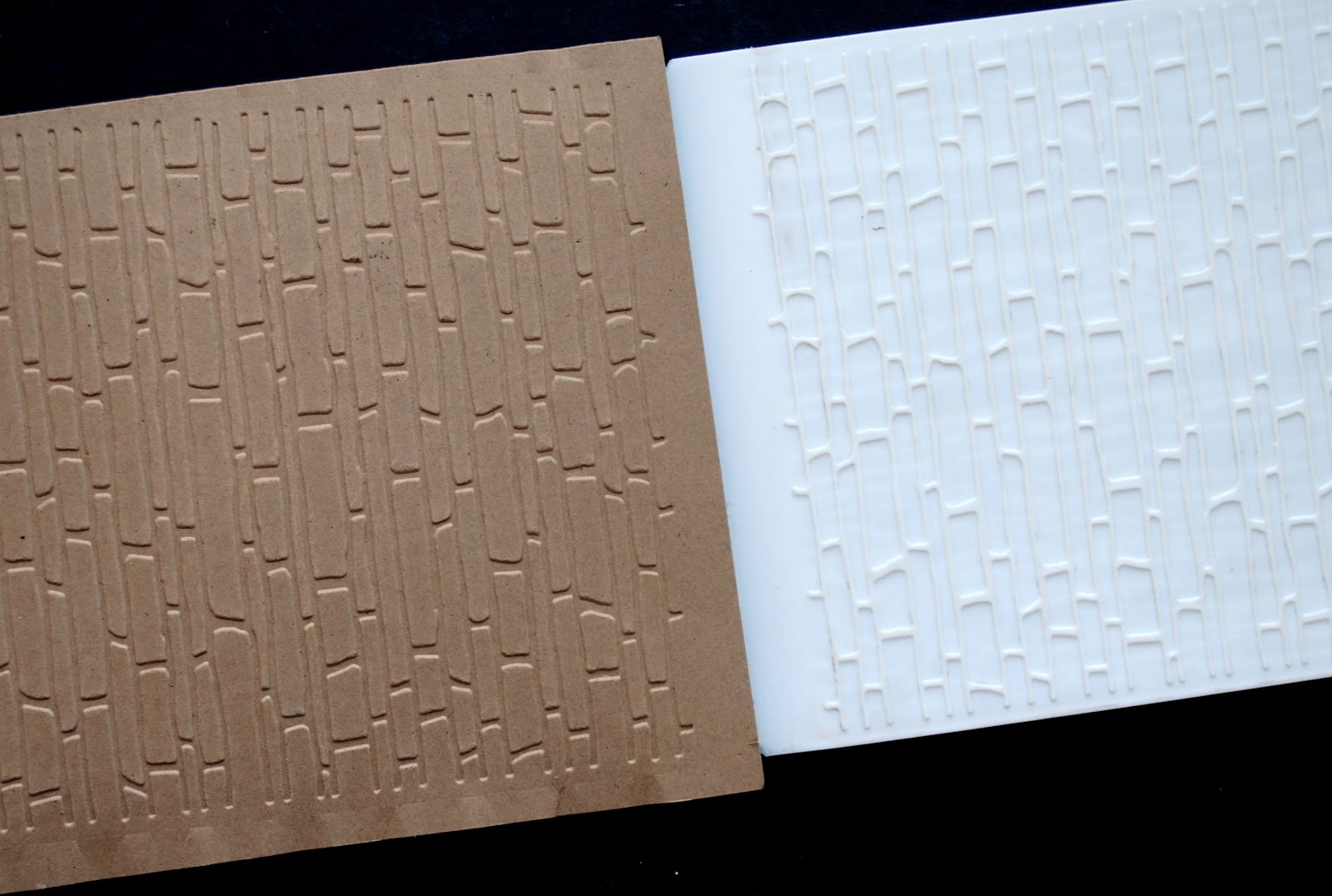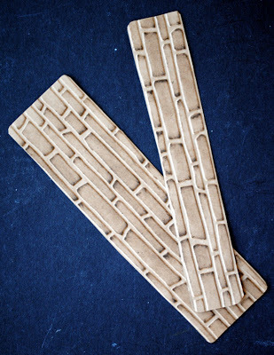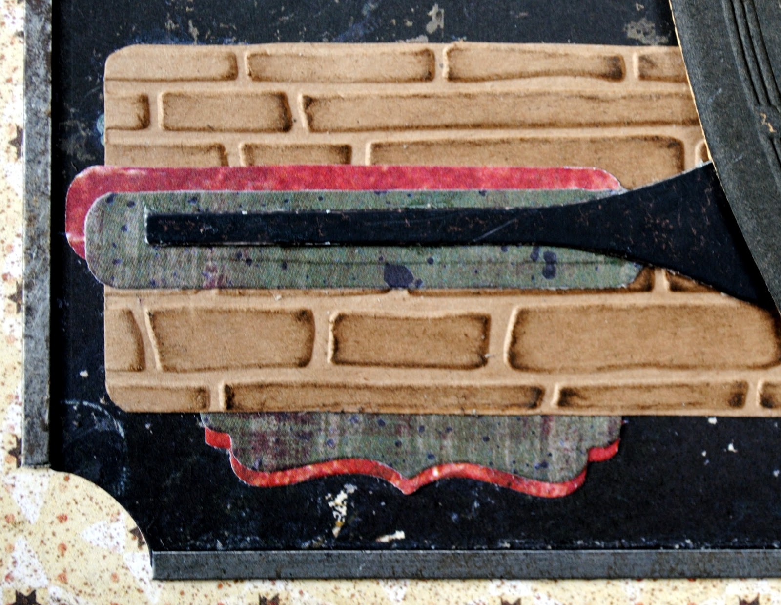 I added texture to kraft colored card stock using Spellbinders M-Bossibilities Bricks Embossing Folder and then lightly rubbed the surface with dye ink to darken the bricks. Lastly, I hand cut the card stock to create two smaller pieces.