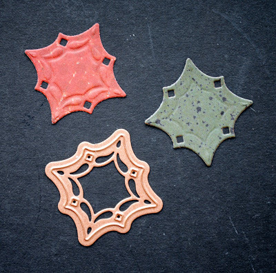 Using one of my own hand painted papers, I cut, embossed and stenciled this element using one of the dies from Spellbinders Nestabilities A2 Filigree Delight.